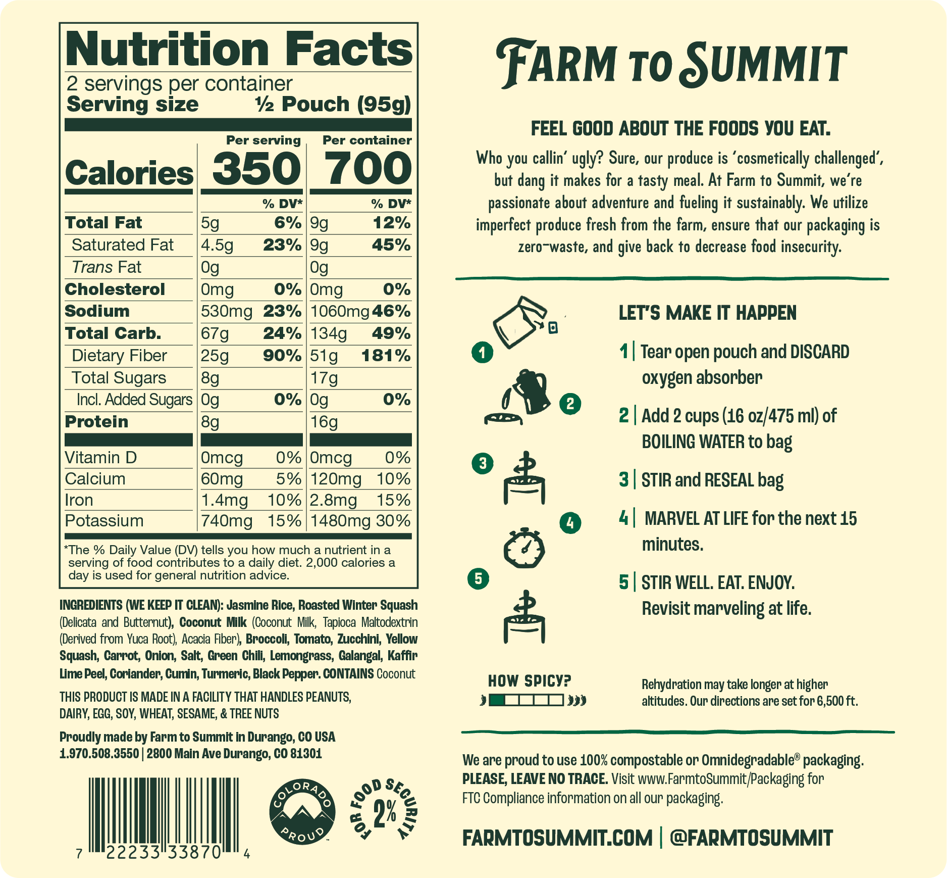 Ingredients: Jasmine Rice, Roasted Winter Squash (Delicata and Butternut), Coconut Milk (Coconut Milk, Tapioca Maltodextrin (Derived from Yuca Root), Acacia Fiber), Broccoli, Tomato, Zucchini, Yellow Squash, Carrot, Onion, Salt, Green Chili, Lemongrass, Galangal, Kaffir Lime Peel, Coriander, Cumin, Turmeric, Black Pepper.