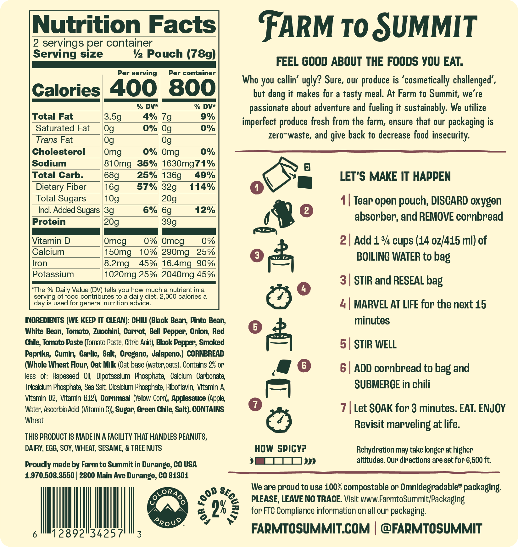CHILI (Black Bean, Pinto Bean, White Bean, Tomato, Zucchini, Carrot, Bell Pepper, Onion, Red Chile, Tomato Paste (Tomato Paste, Citric Acid), Black Pepper, Smoked Paprika, Cumin, Garlic, Olive Oil, Salt, Oregano, Jalapeño, Chipotle.
